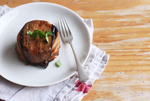 Lightly grease a large casserole dish (or individual ramekins) with olive oil and layer the bottom and sides with the eggplant slices. Fill with a layer of pasta, followed by a layer of béchamel and a layer of eggplant and continue until you finish the last layer with béchamel.