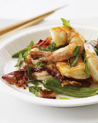For this singular stir-fry, chef Jerry Traunfeld combines sweet shrimp with salty bacon, then adds hot chiles, vermouth and a healthy dose of fresh mint. Serve with a side of pasta or rice.
