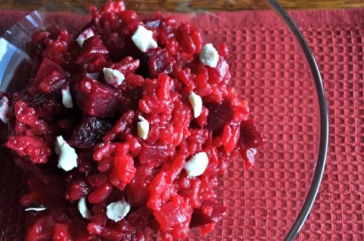 Ladle about a third of the stock or broth into the pan with the rice and bring it up to a bubble, stirring constantly. Simmer the mixture, stirring frequently, until all the liquid is absorbed, about 5 minutes. Ladle another third of the remaining liquid and continue stirring the rice until that liquid has fully absorbed, 4-5 minutes. Ladle in half of the remaining stock and stir the rice another 4-5 minutes. Add in the beet puree and the rest of the stock and cook an additional 4-5 minutes, until the rice is al dente. Season with salt and freshly ground black pepper and stir in the Parmigiano-Reggiano.