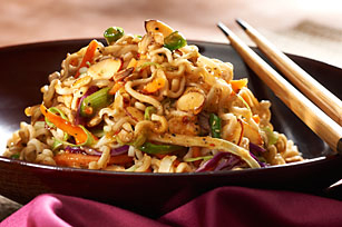 BREAK apart Noodles; place in large bowl. Discard Seasoning Packets or reserve for another use. Add coleslaw blend, onions, sunflower kernels and nuts to noodles; mix lightly.