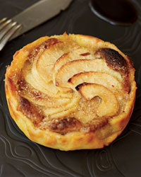 Bake the tart for 1 hour, until the filling is set and the apples are browned and tender. Transfer the tart to a rack and let cool slightly. Remove the ring and serve the tart warm or at room temperature.
