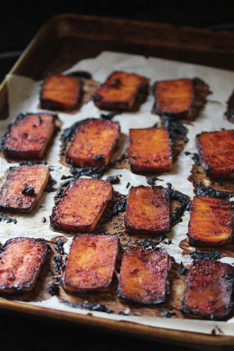 Brush the marinade over the tofu slices and place the sheet in the oven. Bake for 20 minutes, then flip the pieces and brush with additional sauce. Bake for 20 additional minutes.