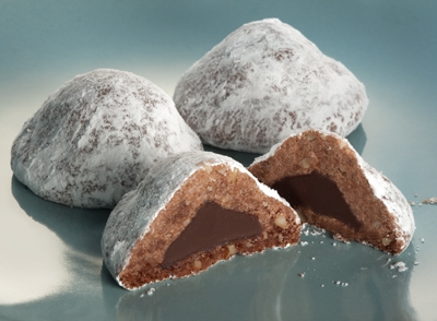 Stir together cookie mix and cocoa. Add butter and pecans. Work with hands until dough forms a ball. Mold scant tablespoon of dough around each chocolate, covering completely. Shape into balls. Place on ungreased cookie sheet.