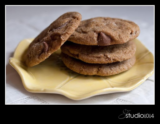 Melt the butter, mix in coffee, vanilla, and rum extract. Stir in until the coffee has dissolved. Add the sugar, beaten eggs, baking soda and powder, mix well. Stir in chocolate chips. Mix until they are evenly distributed. Add flour one cup at a time. Walnut sized balls, flatten with spatula. Bake @ 350F for 9-11 minutes.