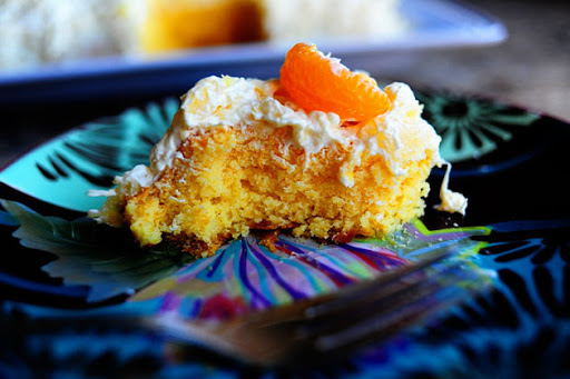 To serve, cut cake into squares and top each square with a mandarin orange slice.