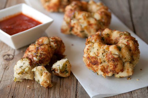 Place bundt pans into the oven and bake for 25-30 minutes until the bread and cheese is golden brown. Serve with warmed marinara sauce or pizza sauce.