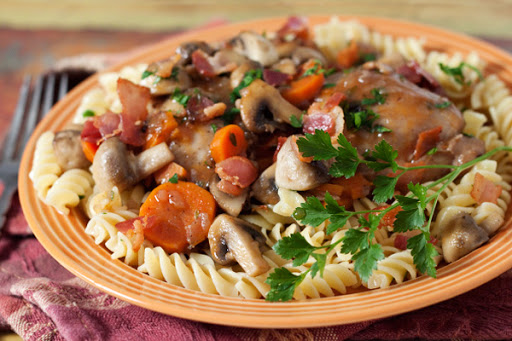 A pressure cooker twist on a classic French chicken stew made with chicken thighs, onions, carrots, mushrooms, and topped with bacon. You can make this slow-cooked favorite even on a weeknight in a pressure cooker.