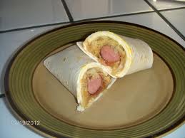 To assemble: top the cheese with one quarter of the beans, some sauerkraut mixture, some chopped raw onion, and a hot dog. Tuck in the ends and roll up like a burrito. Make 3 more the same way. Cut in half if desired and serve!