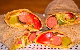 To assemble: pile one quarter of the salad down the middle of a tortilla, top with relish, then add a hot dog and pickle spear. Tuck in the sides, roll up like a burrito. Repeat with the other 3 tortillas. Halve if desired and serve.