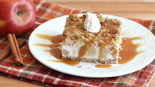 In a large mixing bowl, add the softened ice cream and stir in the apple pie pieces and caramel sauce. Pour the mixture over the crumbs in the 8x8-inch baking dish. Sprinkle the remaining crumbs over the top, cover with aluminum foil and freeze for at least 3 hours.