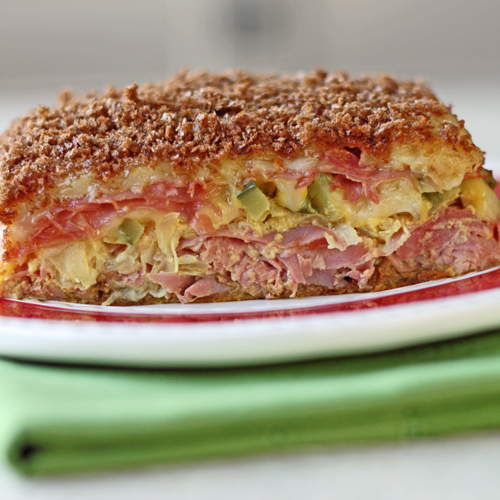 Butter an 11×7-inch baking dish. Cut three pieces of the bread into cubes and line the bottom of the dish with them. Cover with half of the corned beef. Make additional layers in this order: sauerkraut, pickles, caraway seeds, 2 cups of cheese, the remaining beef, and the remaining cheese. With a whisk, beat together the eggs, milk, mustard and Thousand Island dressing until well mixed. Pour over the casserole. Let stand while the oven is heating. Preheat the oven to 350. Make fresh bread crumbs with the remaining two slices of bread using a blender or food processor. Sprinkle bread crumbs over the top of the casserole. Bake at 350 for 40 minutes or until set in the center.