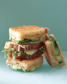 With a rasp grater, finely grate Parmesan onto a plate (you should have 1 cup). Brush one side of bread slices with oil and press into Parmesan, coating completely. Place bread, cheese side down, on a work surface. Spread half the slices with mustard and the other half with jam. Assemble sandwiches with bread, fontina, and arugula. In batches, in a nonstick skillet, cook sandwiches over medium until bread is crisp and golden and fontina is melted, 2 to 3 minutes per side.