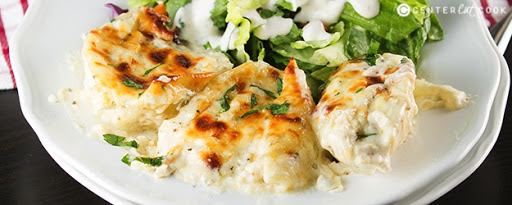 Pour half of the alfredo sauce on the bottom of a 9 x 13 inch casserole dish.
