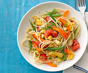 4. In a large bowl, toss pasta with remaining 1 tbsp olive oil. Add tomato mixture, corn, haricots verts, lemon juice, parsley, salt and pepper. Gently toss and add some of the reserved pasta water if too dry. Stir in Parmesan to taste. Serve warm.