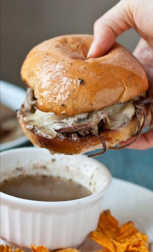 Top with the other half of the sandwich bun. Use the remaining broth from the crockpot as the "dip" for the sandwiches. Dunk and enjoy!