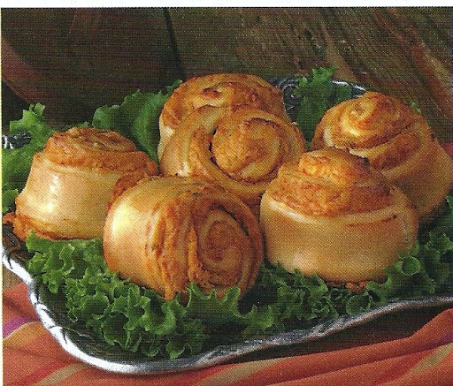 1. Spray counter or surface lightly with cooking spray. Combine rolls to form a ball. Roll into a 12 in X 18 in rectangle. Combine remaining ingredients; mix well. Spread evenly over dough. Roll up jelly-roll style, starting with the long side. With a sharp knife, cut into twelve equal pieces.