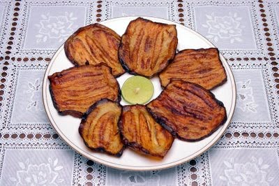 4. Heat olive oil in pan and add eggplant slices, cook until brown.