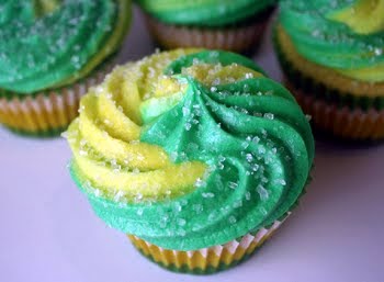 Using gel food coloring, color half the frosting yellow and half green. Place in a piping bag side by side and pipe onto cooled cupcakes.