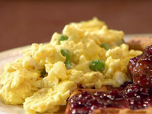 Melt butter in a medium skillet over medium heat. Add shallots and cook 3 to 4 minutes. Whisk eggs with salt and pepper and combine with shallots then stir in the cheese and peas, cook 3 to 4 minutes until eggs are firming up but not yet dry. Serve immediately.
