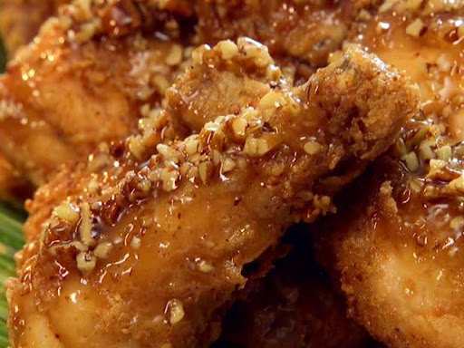 Sprinkle the chicken with House Seasoning. Dip the seasoned chicken into the egg mixture; dredge in the flour mixture, shaking off any excess flour. Fry the chicken in batches, in the hot oil, until browned and crispy, 10 to 15 minutes. Drizzle with Sweet Pecan Glaze.