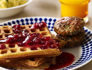 Mix the dry ingredients and chives in a mixing bowl and make a well in the middle. Mix the milk, sour cream, eggs and half the melted butter together then pour into the well. Beat the wet into the dry with a few shift turns but do not over mix the batter. Brush the waffle iron with a little of the remaining butter and cook waffles, keeping then warm and crisp in a low oven. The batter should fill a 4 section iron 3 times, making 12 waffles, 3 per portion. Serve 3 waffles and 2 patties with lingonberry syrup drizzled over top.