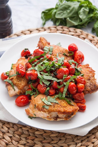 Pan-Seared Crispy Chicken Thighs with Blistered Tomatoes and Basil