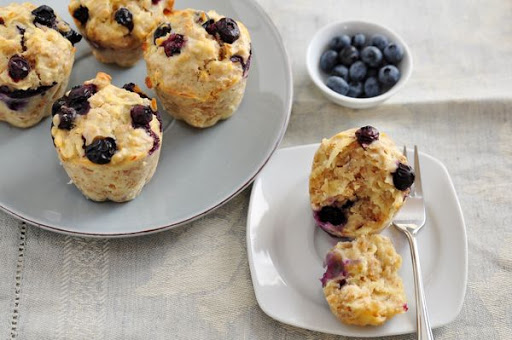 Toss the blueberries with the 2 tablespoons flour and fold them into the batter. Grease the cups of a muffin pan with cooking spray and pour the batter evenly among them. Sprinkle the tops evenly with 2 tablespoons granulated sugar. Bake for 20 minutes, or until the muffins spring back when touched lightly in the center. Remove the muffins from the pans immediately and let cool on a wire rack.