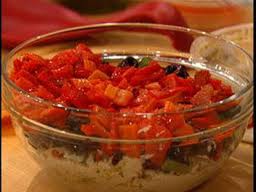 Top with the olives, spreading them out in an even layer, then the roasted red peppers.