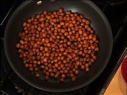 Place the chickpeas in a medium, dry skillet. Season with the curry powder, cayenne, cinnamon, and salt and pepper and toast over medium-high heat for 8 to 10 minutes, until deep golden brown in color and crispy.