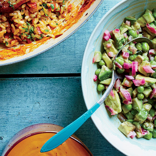 In a bowl, mix the onion with the lime juice and 3/4 teaspoon of salt; let stand for 10 minutes. Fold in the avocados, peas and oil, season with salt and serve.