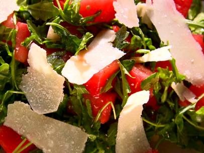With a very sharp knife or a vegetable peeler, shave the Parmesan into large shards and sprinkle them on the arugula and watermelon. Sprinkle with salt and serve.
