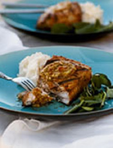 Mahimahi with Garlic-Yogurt Potatoes and Almond-Orange Pesto