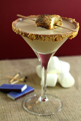 Spear marshmallows with toothpicks or long skewer; toast marshmallows over flame and garnish cocktail.