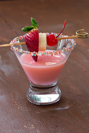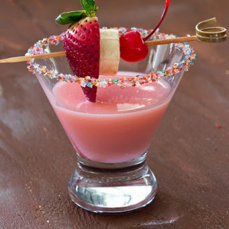 This sweet desert martini is festive and colorful, garnished with a strawberry slice, banana slice, and maraschino cherry. Great for parties!