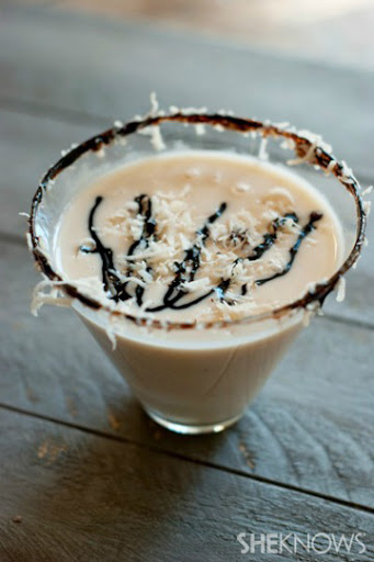 In a shaker or a blender add the coconut rum, Frangelico, chocolate liqueur, chocolate syrup and heavy cream or half-and-half.