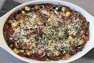 ADD tomatoes, bring to boil. Reduce heat to low; cover. Simmer 15 min. or until vegetables are tender, stirring occasionally. Pour mixture into casserole dish; sprinkle with cheese. Cover and refrigerate until ready to serve.