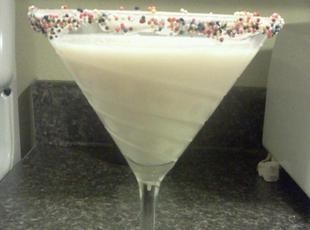 Prepare chilled martini glass with frosting rim, dipped in nonpareils. Combine 1st five ingredients in a martini shaker. Shake with ice and strain to serve. Enjoy!