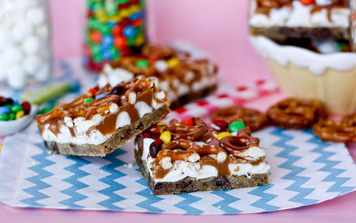 4. Evenly drizzle caramel sauce over marshmallow. Immediately begin pressing pretzels into the top of the bars. Sprinkle with mini M&Ms and let bars cool completely. For neater cutting, chill bars before cutting and serving. Keep bars stored in refrigerator.