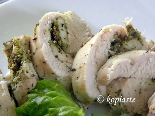 With meat mallet, pound chicken to 1/4" thickness. Spread 1 tsp pesto on each breast. Place brie in middle. Fold sides and ends to seal. Place seam-side-down in casserole dish.