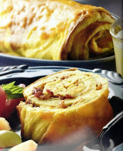 6. Remove omelet from the oven; immediately spread with Dijon mustard. sprinkle with 3/4 of the cheese; top with bacon. Starting on one short side, roll up jelly roll fashion, removing parchment paper as you roll.