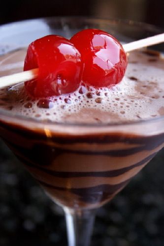 Combine the chocolate, dark crème de cacao, Bailey's, and vanilla vodka in a cocktail shaker filled with ice and shake moderately.