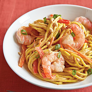 2. Cook noodles in boiling water 1 minute. Add carrots and shrimp; cook 2 minutes or until shrimp are done. Drain in a colander over a bowl, reserving cooking liquid. Rinse noodle mixture under cold water; drain. Add noodle mixture, bell pepper, and 1/4 cup onions to peanut butter mixture, tossing to combine. Add enough of reserved cooking liquid to keep sauce creamy. Sprinkle with remaining 1/4 cup onions and peanuts.