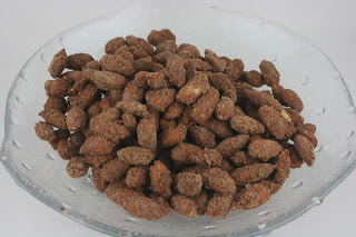 In a larger mixing bowl, whisk together the egg white and vanilla extract. Pour the almonds into this bowl and stir well to coat. Add your cinnamon mixture to the top of the nuts and toss with spoons to fully coat (too many nuts to do the plastic bag toss---you'd have to do batches).