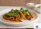 5. To assemble the fajitas: slice the onions and peppers into thin strips and then slice the chicken. Place some peppers, onions, chicken and cilantro in a tortilla topped with the spiced yogurt and the avocado sauce.