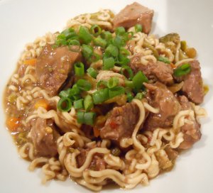 At the end of cooking time, discard spice packets from ramen noodles and crumble the noodles into meat mixture. Cover and let stand 10 minutes more and then stir. Add the chopped green onions to each serving.
