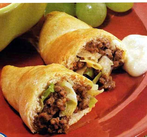 3. Separate dough into 16 triangles; press or roll each until slightly larger. Spoon about 1/4 cup beef mixture onto shortest side of each triangle. Roll up, starting at shortest side of triangle, gently wrapping dough around beef mixture and rolling to opposite point. Pinch edge to seal. Place point side down on ungreased large cookie sheet.