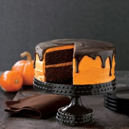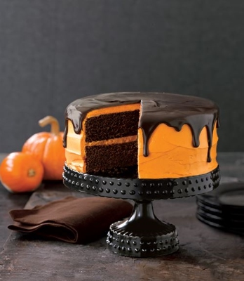 Step 1: Frost Beat 6 ounces softened cream cheese using a mixer set on medium-high speed until fluffy. Add 1 1/2 cups confectioners' sugar, 2 1/4 teaspoons cocoa, 1/4 teaspoon cinnamon, and 3/4 teaspoon vanilla and beat on low speed until well combined. In a separate bowl, beat 1 1/2 cups heavy cream with 3/4 cup confectioners' sugar and a scant 1/4 teaspoon orange food coloring on medium-high to soft peaks. Gently fold the whipped cream into the cream cheese mixture until well combined. Spread 1 cup frosting between the two layers and use the remaining frosting to ice the top and sides of the cake. Chill 30 minutes and proceed to step 2. Makes 3 cups.