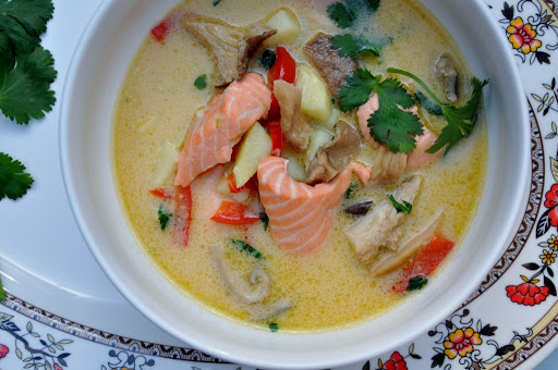 Empty coconut milk into a measuring cup and add enough stock to make 2 1/2 cups total. Add curry paste, ginger, garlic, jalapeño, fish sauce, and palm sugar into milk and broth and add to pot. Bring to a boil and simmer for a couple of minutes to blend flavours, then add cubed salmon.