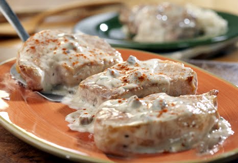 Heat the oil in a 10-inch skillet over medium-high heat. Add the pork and cook until well browned on both sides. Stir the soup, milk and ½ package salad dressing mix in the skillet and heat to a boil. Reduce the heat to low. Cover and cook for 10 minutes or until the pork is cooked through. Sprinkle with the paprika. Serve with the Ranch-Style Rice.