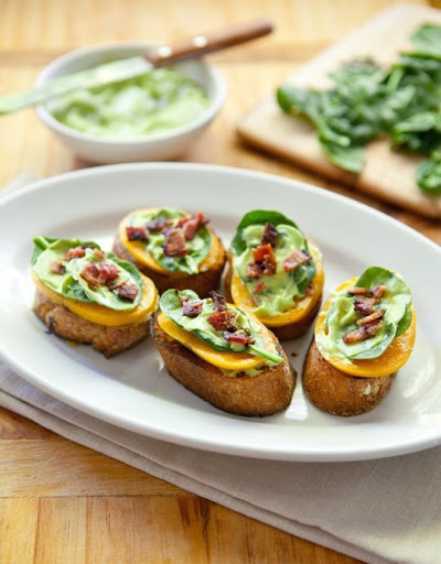 To assemble toasts: Spread a teaspoon or so of the avocado cream onto a slice of toasted bread and top with a tomato slice. Then add an additional spread of avocado cream, a few spinach leaves, another dollop of avocado cream, and top with a scattering of bacon pieces. Enjoy immediately.